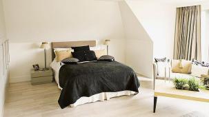 This apartment with nice shades of blue and a beautiful bathroom will help you to relax after work.